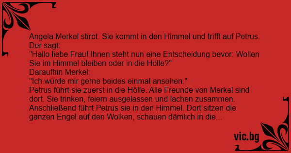 Petrus führt sie zuerst in die Hölle. Alle Freunde von Merkel sind dort. Sie trinken, feiern ausgelassen und lachen zusammen. Anschließend führt Petrus sie in den Himmel. Dort sitzen die ganzen Engel auf den Wolken, schauen dämlich in die Gegend und spielen monoton auf ihren Harfen. Schließlich sagt Merkel zu Petrus:
