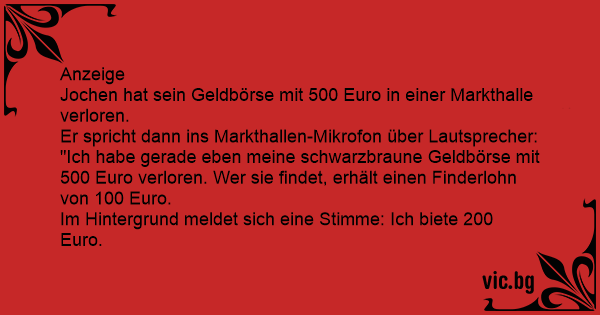 "Ich habe gerade eben meine schwarzbraune Geldbörse mit 500 Euro verloren. Wer sie findet, erhält einen Finderlohn von 100 Euro.