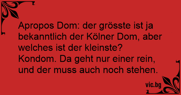 Was ist der kleinste Dom der Welt? Der Kondom. Kann nur einer drin stehen. Und sogar die Glocken hängen draußen! Hvad er verdens mindste domkirke? Et kondom for der er kun én ståplads og klokkerne hænger udenfor. - Vet du vilken som är världens minsta katedral? - Nä. - Kon-Domen. Den har en ståplats och klockorna hänger utanför!