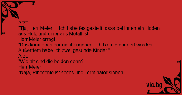"Tja, Herr Meier ... Ich habe festgestellt, dass bei ihnen ein Hoden aus Holz und einer aus Metall ist."
