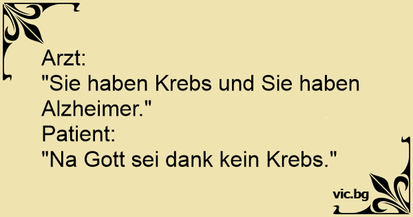 Sagt der Arzt zum Patienten: "Es tut mir leid, Sie haben Krebs und Alzheimer. Darauf der Patient: "Gott sei Dank! Nur gut, dass ich keinen Krebs hab!"