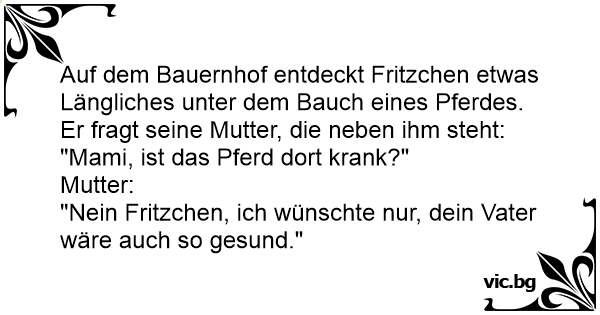 Auf dem Bauernhof entdeckt Fritzchen etwas Längliches unter dem Bauch eines Pferdes. Er fragt seine Mutter, die neben ihm steht: