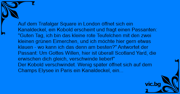 "Guten Tag, ich bin das kleine rote Teufelchen mit den zwei kleinen grünen Eimerchen, und ich möchte hier gern etwas klauen - wo kann ich das denn am besten?" Antwortet der Passant: Um Gottes Willen, hier ist überall Scotland Yard, die erwischen dich gleich, verschwinde lieber!"