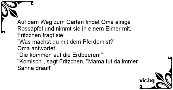 Auf dem Weg zum Garten findet Oma einige Rossäpfel und nimmt sie in einem Eimer mit. Fritzchen fragt sie: