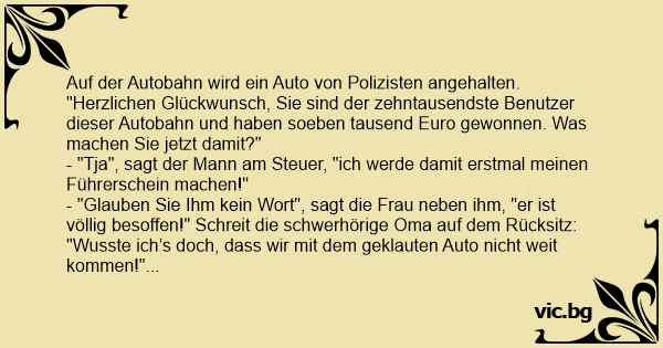 Die Polizei stoppt auf einer Brücke ein Auto. Der Polizei sagt zum Mann am Steuer: ,Sie sind das millionste Auto, das über diese Brücke fährt und gewinnen 100.000 €. Was machen Sie mit dem Geld?"...