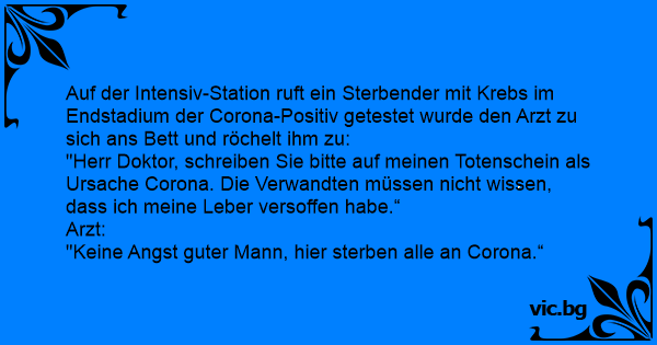 "Herr Doktor, schreiben Sie bitte auf meinen Totenschein als Ursache Corona. Die Verwandten müssen niсhт wissen, dass ich meine Leber versoffen habe.“