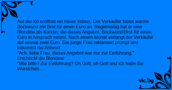 Auf der Kö eröffnet ein neuer Imbiss. Der Verkäufer bietet warme Bockwurst mit Brot für einen Euro an. Regelmäßig hat er eine Blondine als Kundin, die dieses Angebot, Bockwurst/Brot für einen Euro in Anspruch nimmt. Nach einem Monat verlangt der Verkäufer auf einmal zwei Euro. Die junge Frau reklamiert prompt und bekommt die Antwort: