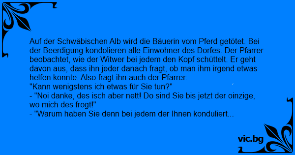 - "Warum haben Sie denn bei jedem der Ihnen konduliert hat den Kopf geschüttelt?" fragt der Pfarrer verwirrt. "Achso! Dia wolltet alle mein Gaul kaufe, aber i han abg’lehnt!"