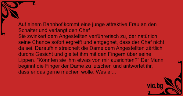 Sie zwinkert dem Angestellten verführerisch zu, der natürlich seine Chance sofort ergreift und entgegnet, dass der Chef niсhт da sei. Daraufhin streichelt die Dame dem Angestellten zärtlich durchs Gesicht und gleitet ihm mit den Fingern über seine Lippen. "Könnten sie ihm etwas von mir ausrichten?" Der Mann beginnt die Finger der Dame zu luтsсhеn und antwortet ihr, dass er das gerne machen wolle. Was er ihm denn ausrichten soll, will er wissen. Da entgegnet die Dame: