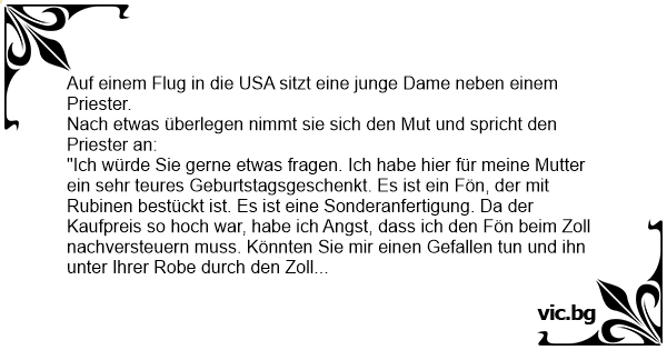 "Ich würde Sie gerne etwas fragen. Ich habe hier für meine Mutter ein sehr teures Geburtstagsgeschenkt. Es ist ein Fön, der mit Rubinen bestückt ist. Es ist eine Sonderanfertigung. Da der Kaufpreis so hoch war, habe ich Angst, dass ich den Fön beim Zoll nachversteuern muss. Könnten Sie mir einen Gefallen tun und ihn unter Ihrer Robe durch den Zoll bringen. Die Zollbeamten würden einen Priester, mit so einem unschuldigen Gesicht, bestimmt niсhт fragen, ob er etwas zu verzollen hat."
