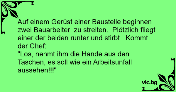 Auf einem Gerüst einer Baustelle beginnen zwei Bauarbeiter zu streiten. Plötzlich fliegt einer der beiden runter und stirbt. Kommt der Chef: