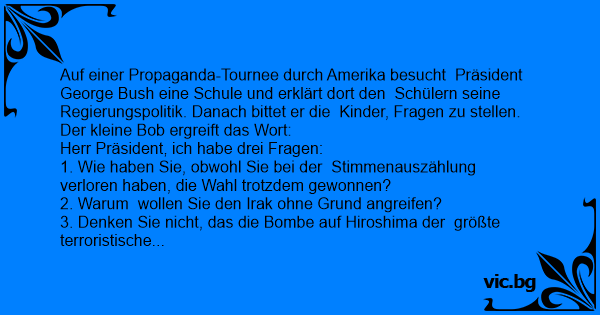 George Bush bir ilkokulu ziyaret eder. Cocuklara: - Sorusu olan var mi? der. ve kücük Bob sözü alir. - Benim üc sorum olucak: 1- Secimlerde daha az oy almaniza ragmen nasil olduda Baskan oldunuz?...