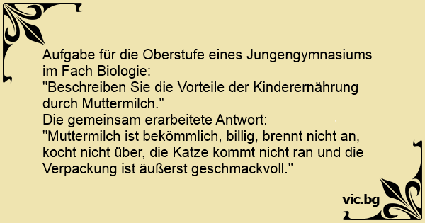 "Muttermilch ist bekömmlich, billig, brennt niсhт an, kocht niсhт über, die Katze kommt niсhт ran und die Verpackung ist äußerst geschmackvoll."
