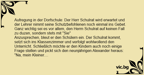 Anzusprechen, bleut er den Schülern ein. Der Schulrat kommt, setzt sich ins Klassenzimmer und verfolgt wohlwollend den Unterricht. Schließlich möchte er den Kindern auch noch einige Frage stellen und pickt sich den neunjährigen Alexander heraus:
