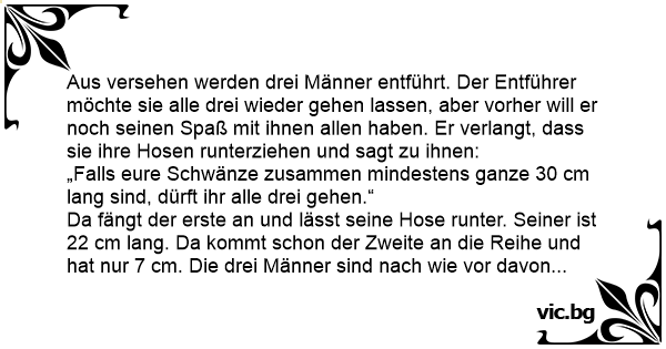 Da fängt der erste an und lässt seine Hose runter. Seiner ist 22 cm lang. Da kommt schon der Zweite an die Reihe und hat nur 7 cm. Die drei Männer sind nach wie vor davon überzeugt, dass sie endlich gehen dürfen. Nun ist noch der Dritte an der Reihe, er zieht seine Hose runter, seiner ist genau 1 cm. Also habe sie zusammen genau 30, also dürfen sie gehen. Draußen, als sie wieder in der Freiheit sind, sagt der erste: