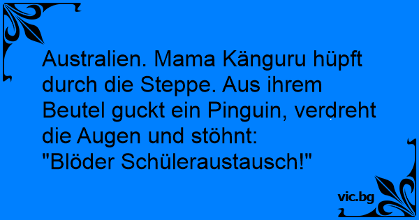 Ein Känguru hoppelt durch die Steppe. Da schaut ein kleiner Pinguin aus dem Beutel wischt sich den Schweiß ab und sagt: "Blöder Schüleraustausch!"