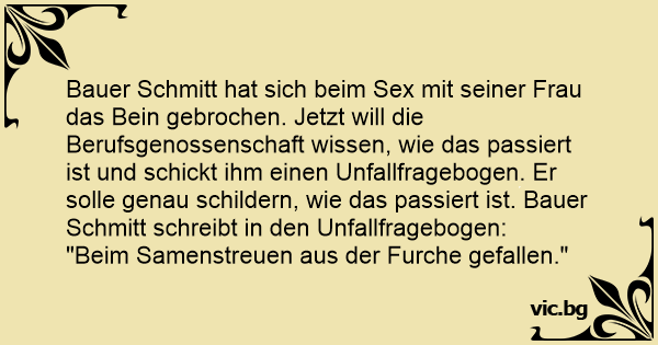 Bauer Schmitt hat sich beim Sеx mit seiner Frau das Bein gebrochen. Jetzt will die Berufsgenossenschaft wissen, wie das passiert ist und schickt ihm einen Unfallfragebogen. Er solle genau schildern, wie das passiert ist. Bauer Schmitt schreibt in den Unfallfragebogen: