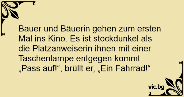 Bauer und Bäuerin gehen zum ersten Mal ins Kino. Es ist stockdunkel als die Platzanweiserin ihnen mit einer Taschenlampe entgegen kommt. „Pass auf!“, brüllt er, „Ein Fahrrad!“