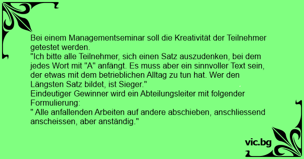 "Ich bitte alle Teilnehmer, sich einen Satz auszudenken, bei dem jedes Wort mit "A" anfängt. Es muss aber ein sinnvoller Text sein, der etwas mit dem betrieblichen Alltag zu tun hat. Wer den