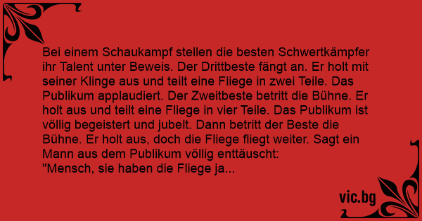 Ein Chinese, ein Japaner und ein Jude stellen sich einer Samuraiprüfung. Hierzu wird ihnen vom weisesten aller Samurai-Meister aufgetragen, eine Fliege im Flug mit dem Samurai-Schwert zu zerteilen....