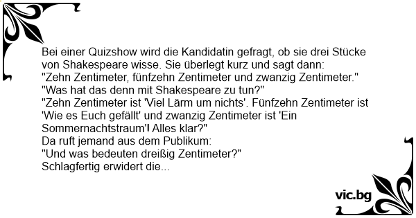 Bei einer Quizshow wird die Kandidatin gefragt, ob sie drei Stücke von Shakespeare wisse. Sie überlegt kurz und sagt dann: