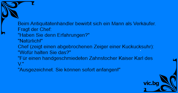 Beim Antiquitätenhändler bewirbt sich ein Mann als Verkäufer.