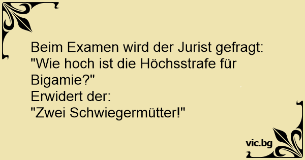 Професору права на лекції задають питання: - Що таке бігамія, і як вона карається? - Бігамія - це наявність двох дружин, яке карається наявністю двох тещ.