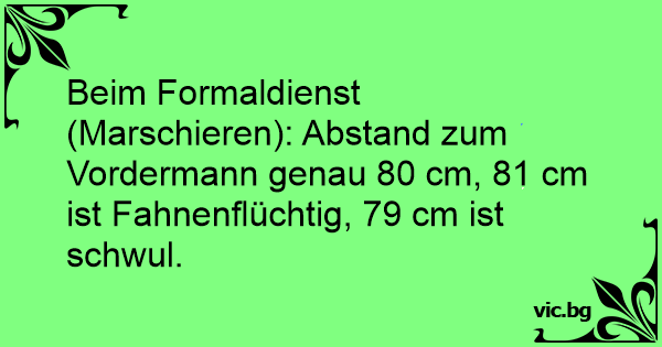 Beim Formaldienst (Marschieren): Abstand zum Vordermann genau 80 cm, 81 cm ist Fahnenflüchtig, 79 cm ist schwul.