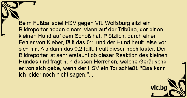 Beim Fußballspiel HSV gegen VfL Wolfsburg sitzt ein Bildreporter neben einem Mann auf der Tribüne, der einen kleinen Hund auf dem Schoß hat. Plötzlich, durch einen Fehler von Kleber, fällt das 0:1 und der Hund heult leise vor sich hin. Als dann das 0:2 fällt, heult dieser noch lauter. Der Bildreporter ist sehr erstaunt ob dieser Reaktion des kleinen Hundes und fragt nun dessen Herrchen, welche Geräusche er von sich gebe, wenn der HSV ein Tor schießt. "Das kann ich leider noch niсhт sagen." meint der Mann, "Ich komm mit Willy erst seit zwei Jahren zu den HSV-Spielen."