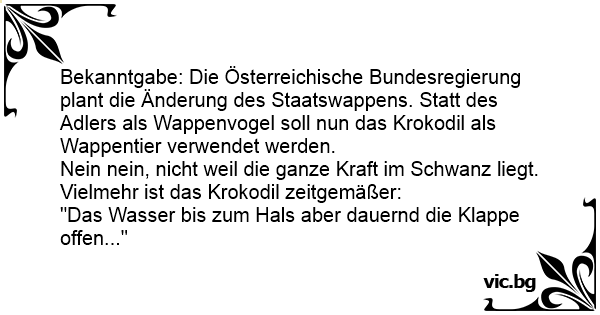 Bekanntgabe: Die Österreichische Bundesregierung plant die Änderung des Staatswappens. Statt des Adlers als Wappenvogel soll nun das Krokodil als Wappentier verwendet werden.