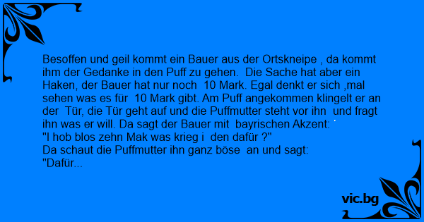 Besoffen und geil kommt ein Bauer aus der Ortskneipe , da kommt ihm der Gedanke in den Рuff zu gehen. Die Sache hat aber ein Haken, der Bauer hat nur noch 10 Mark. Egal denkt er sich ,mal sehen was es für 10 Mark gibt. Am Рuff angekommen klingelt er an der Tür, die Tür geht auf und die Puffmutter steht vor ihn und fragt ihn was er will. Da sagt der Bauer mit bayrischen Akzent: