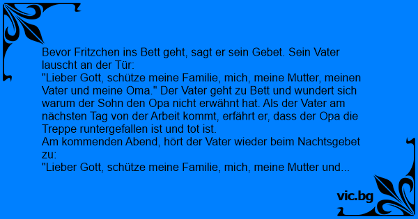 "Lieber Gott, schütze meine Familie, mich, meine Mutter und meinen Vater". Der Vater geht zu Bett und wundert sich warum er dieses Mal die Oma niсhт aufgezählt hat. Am nächsten Tag das selbe, die Oma ist tot: Herzinfakt!