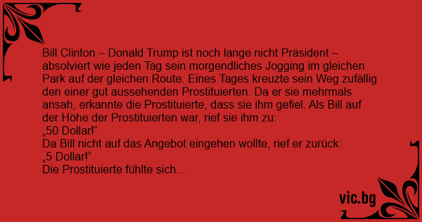 Bill Clinton – Donald Trump ist noch lange niсhт Präsident – absolviert wie jeden Tag sein morgendliches Jogging im gleichen Park auf der gleichen Route. Eines Tages kreuzte sein Weg zufällig den einer gut aussehenden Prostituierten. Da er sie mehrmals ansah, erkannte die Prostituierte, dass sie ihm gefiel. Als Bill auf der Höhe der Prostituierten war, rief sie ihm zu: