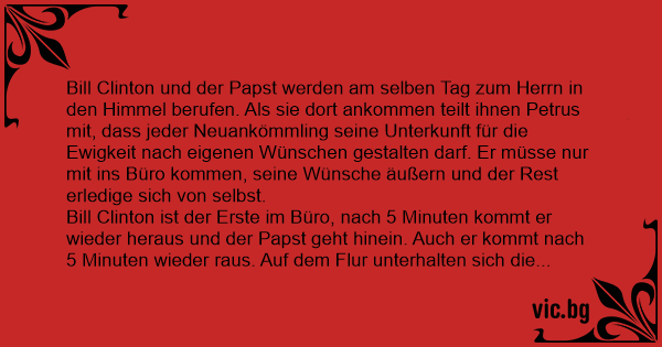 Bill Clinton und der Papst werden am selben Tag zum Herrn in den Himmel berufen. Als sie dort ankommen teilt ihnen Petrus mit, dass jeder Neuankömmling seine Unterkunft für die Ewigkeit nach eigenen Wünschen gestalten darf. Er müsse nur mit ins Büro kommen, seine Wünsche äußern und der Rest erledige sich von selbst.