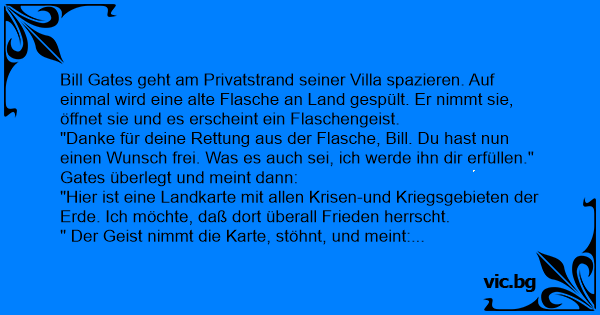 Bill Gates geht am Privatstrand seiner Villa spazieren. Auf einmal wird eine alte Flasche an Land gespült. Er nimmt sie, öffnet sie und es erscheint ein Flaschengeist.
