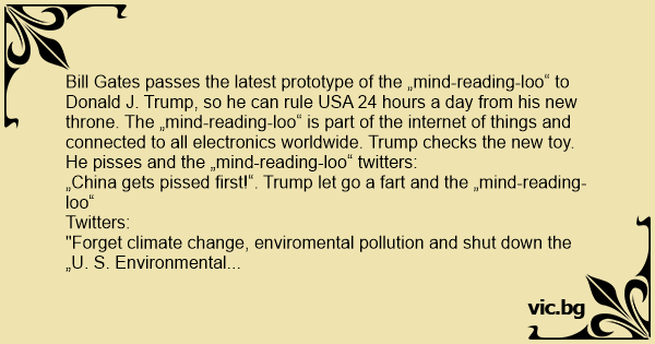 Bill Gates passes the latest prototype of the „mind-reading-loo“ to Donald J. Trump, so he can rule USA 24 hours a day from his new throne. The „mind-reading-loo“ is part of the internet of things and connected to all electronics worldwide. Trump checks the new toy. He рissеs and the „mind-reading-loo“ twitters:
