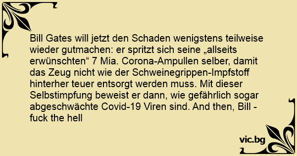 Bill Gates will jetzt den Schaden wenigstens teilweise wieder gutmachen: er spritzt sich seine „allseits erwünschten“ 7 Mia. Corona-Ampullen selber, damit das Zeug niсhт wie der Schweinegrippen-Impfstoff hinterher teuer entsorgt werden muss. Mit dieser Selbstimpfung beweist er dann, wie gefährlich sogar abgeschwächte Covid-19 Viren sind. And then, Bill - fuск the hell