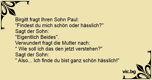 Germa fragt ihren Sohn Nils: „Findest du mich schön oder hässlich?“ „Beides!“ „Wie kann ich das verstehen?“ „Also… Ich finde dich ganz schön hässlich!“