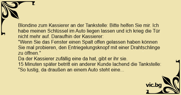 Blondine zum Kassierer an der Tankstelle: Bitte helfen Sie mir. Ich habe meinen Schlüssel im Auto liegen lassen und ich krieg die Tür niсhт mehr auf. Daraufhin der Kassierer: