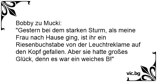"Gestern bei dem starken Sturm, als meine Frau nach Hause ging, ist ihr ein Riesenbuchstabe von der Leuchtreklame auf den Kopf gefallen. Aber sie hatte großes Glück, denn es war ein weiches B!"