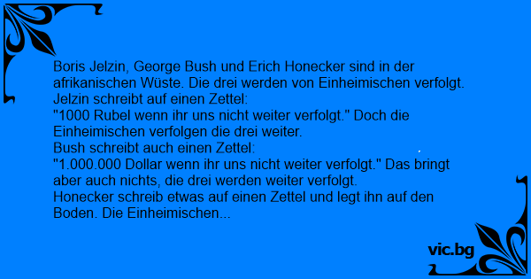 Jelzin und Bush schauen ganz verwundert und fragen Honecker, was er denn auf den Zettel geschrieben hat. Honecker: