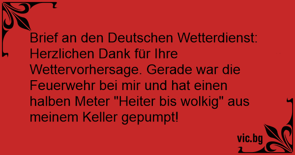 Brief an den Deutschen Wetterdienst: Herzlichen Dank für Ihre Wettervorhersage. Gerade war die Feuerwehr bei mir und hat einen halben Meter "Heiter bis wolkig" aus meinem Keller gepumpt!
