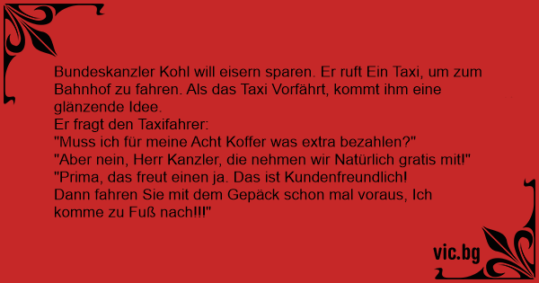 Bundeskanzler Kohl will eisern sparen. Er ruft Ein Taxi, um zum Bahnhof zu fahren. Als das Taxi Vorfährt, kommt ihm eine glänzende Idee.
