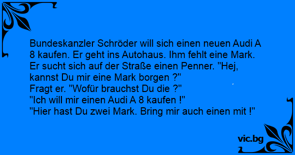 Bundeskanzler Schröder will sich einen neuen Audi A 8 kaufen. Er geht ins Autohaus. Ihm fehlt eine Mark. Er sucht sich auf der Straße einen Реnnеr. "Hej, kannst Du mir eine Mark borgen ?"