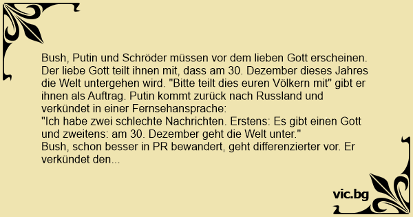 Bush, Putin und Schröder müssen vor dem lieben Gott erscheinen. Der liebe Gott teilt ihnen mit, dass am 30. Dezember dieses Jahres die Welt untergehen wird. "Bitte teilt dies euren Völkern mit" gibt er ihnen als Auftrag. Putin kommt zurück nach Russland und verkündet in einer Fernsehansprache: