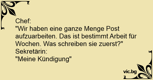 Chef: "Wir haben eine ganze Menge Post aufzuarbeiten. Das ist bestimmt Arbeit für Wochen. Was schreiben sie zuerst?" Sekretärin: "Meine Kündigung"