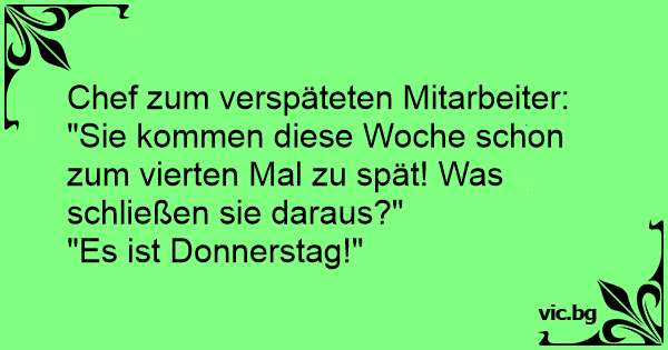 Boss padotajam: - Jūs jau piekto dienu pēc kārtas kavējat darbu!Kādi secinājumi,pēc jūsu domām,man būtu jāizdara? - Ka šodien piektdiena!