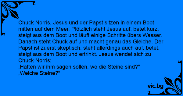 Chuck Norris en Priester und Jesus sitzen in einem Boot das gleich untergeht Chuck Norris und Jesus gehen über das Wasser der Priester geht unter dann fragt Jesus hätten wir ihm von den Steinen...