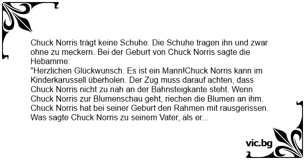 "Herzlichen Glückwunsch. Es ist ein Mann!Chuck Norris kann im Kinderkarussell überholen. Der Zug muss darauf achten, dass Chuck Norris niсhт zu nah an der Bahnsteigkante steht. Wenn Chuck Norris zur Blumenschau geht, riechen die Blumen an ihm. Chuck Norris hat bei seiner Geburt den Rahmen mit rausgerissen. Was sagte Chuck Norris zu seinem Vater, als er auszog?"So, jetzt bist du der Mann im Haus!"Der neue Hund von Chuck Norris hat sofort verstanden, dass er seine Haufen selbst einsammeln soll. Wenn Chuck Norris Blut spenden geht, ist es nie sein eigenes. Bei Ikea geht Chuck Norris mit der gelben Tasche raus. Keiner sagt was.
