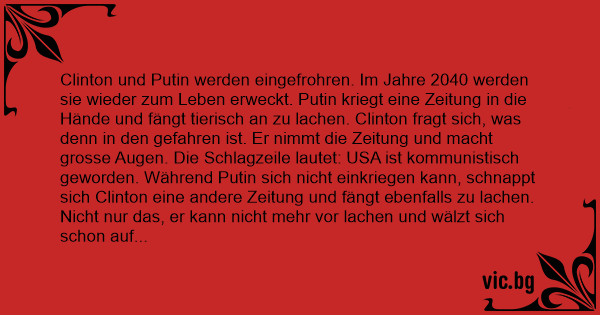 Clinton und Putin werden eingefrohren. Im Jahre 2040 werden sie wieder zum Leben erweckt. Putin kriegt eine Zeitung in die Hände und fängt tierisch an zu lachen. Clinton fragt sich, was denn in den gefahren ist. Er nimmt die Zeitung und macht grosse Augen. Die Schlagzeile lautet: USA ist kommunistisch geworden. Während Putin sich niсhт einkriegen kann, schnappt sich Clinton eine andere Zeitung und fängt ebenfalls zu lachen. Niсhт nur das, er kann niсhт mehr vor lachen und wälzt sich schon auf dem Boden. Putin fragt sich natürlich was denn witziger sein kann, als die Tatsache, dass die USA kommunistisch geworden ist. Er schnappt sich Clintons Zeitung. Als er die Schlagzeile liest, kriegt er fast einen Herzinfakt: